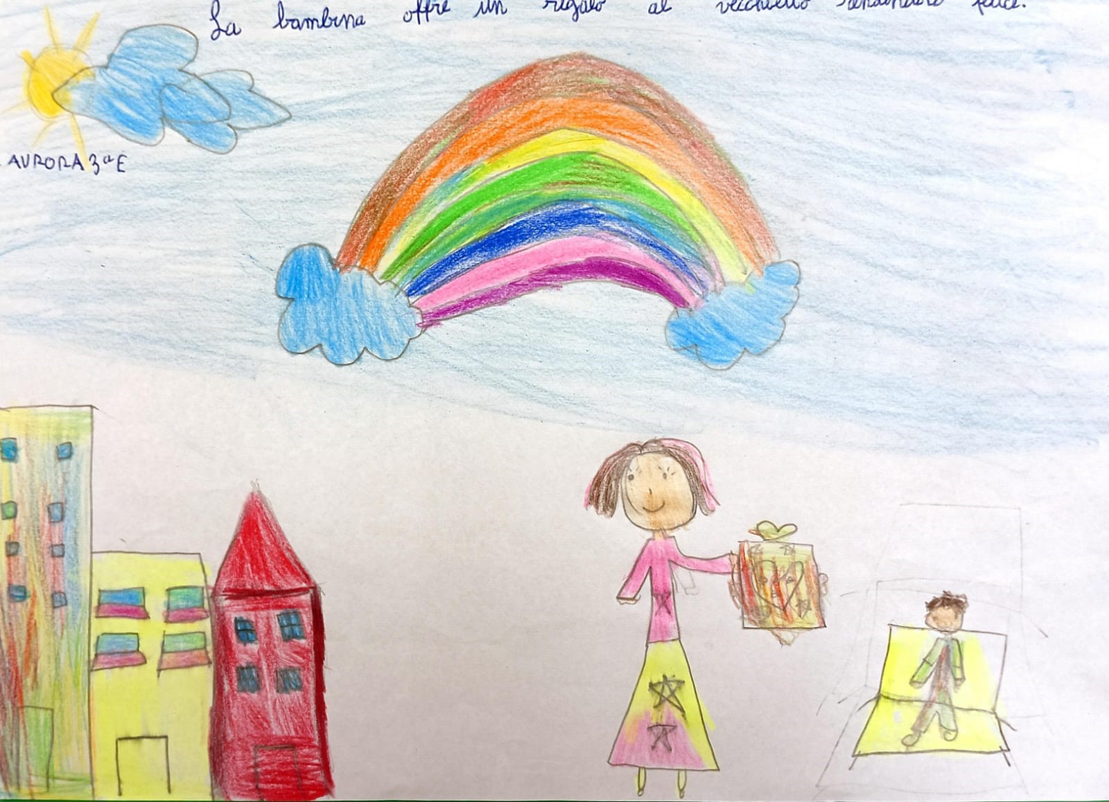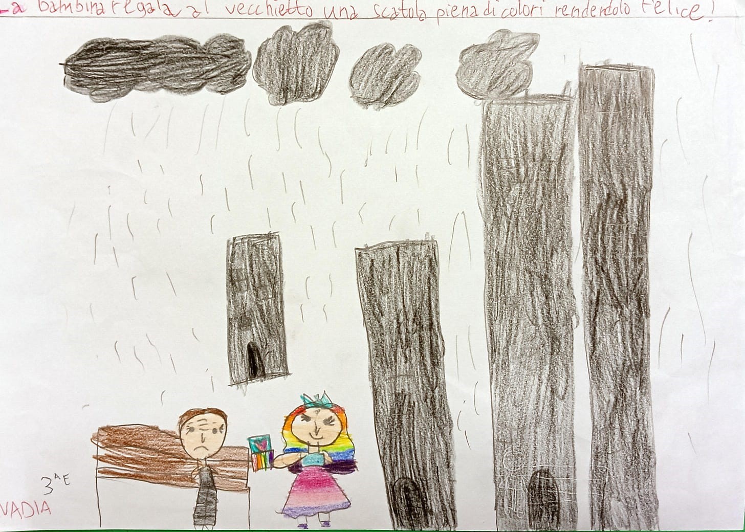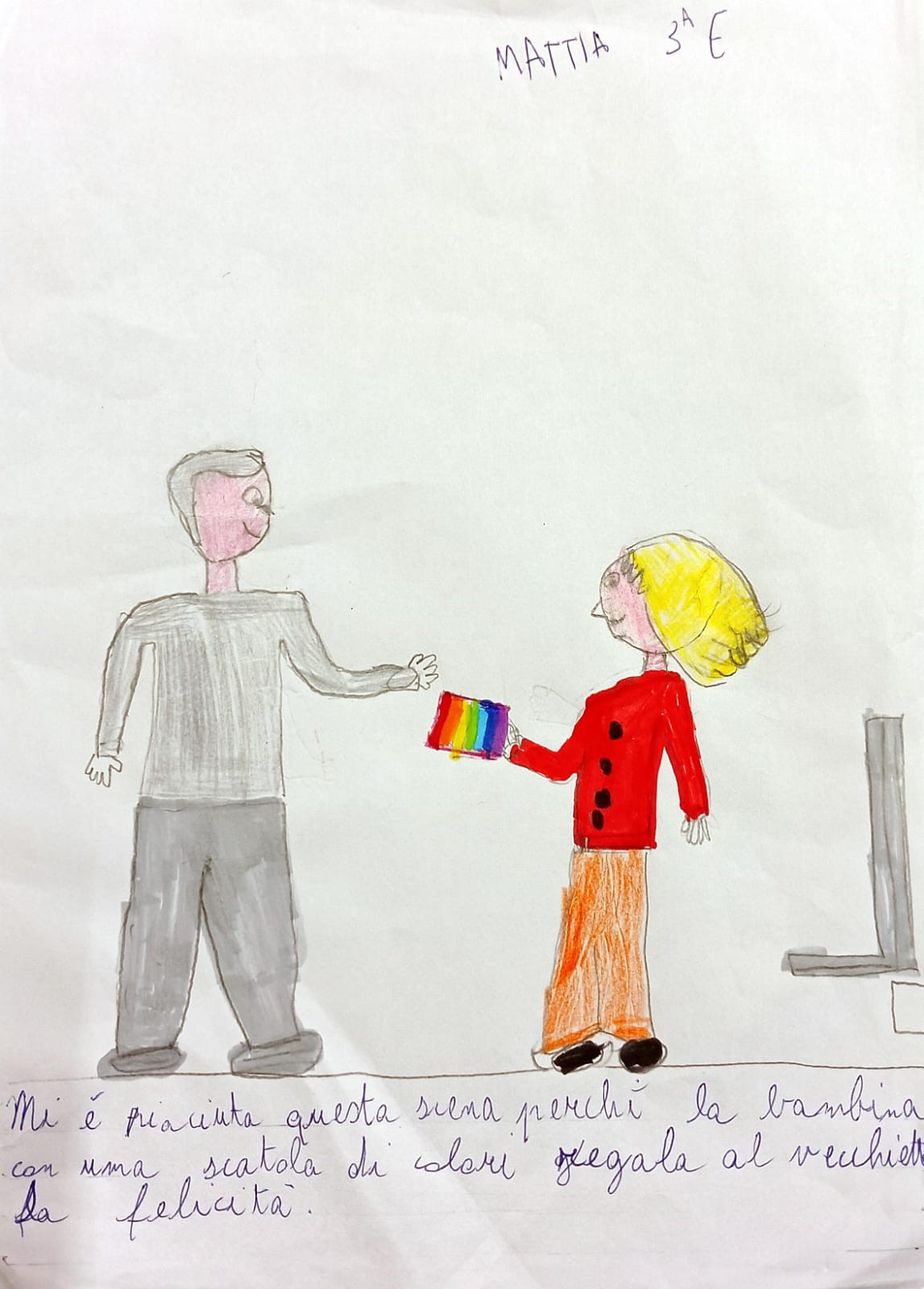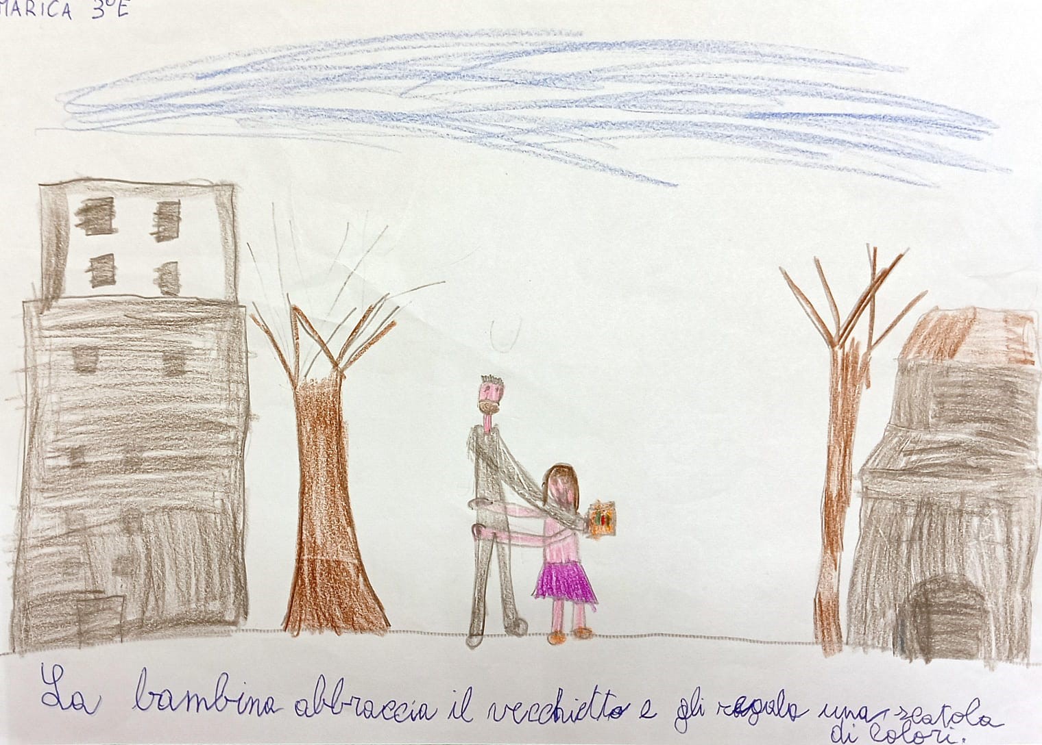 La bambina si commosse tanto e pensò come poteva renderlo felice. All’improvviso si ricordò del suo bel paesino che aveva lasciato e volle regalargli una scatola di colori ed un forte abbraccio.
