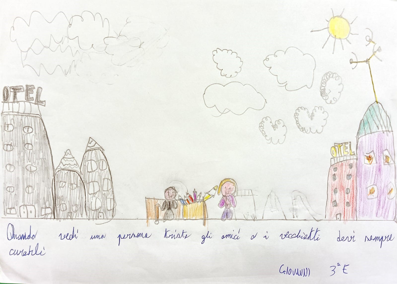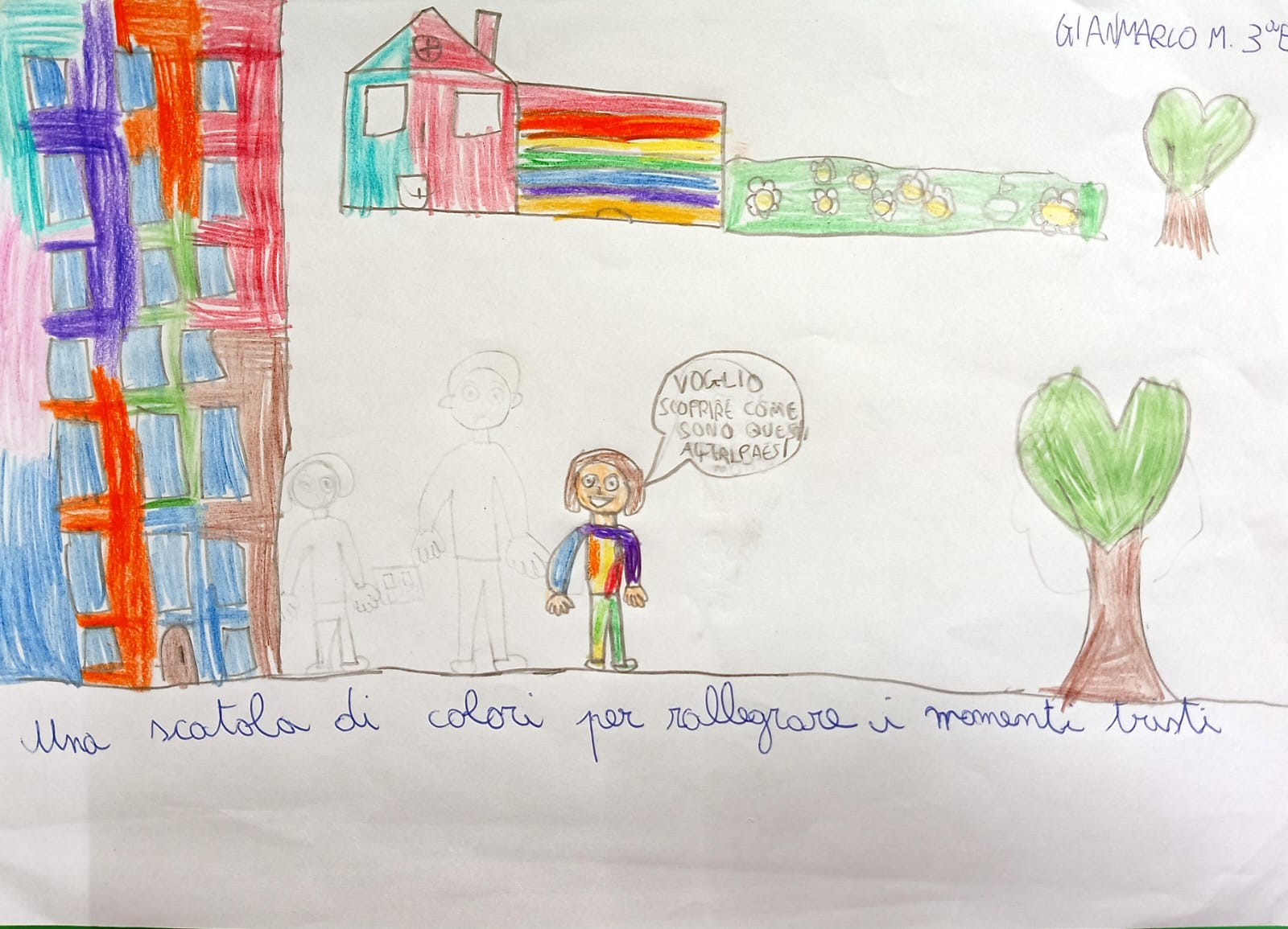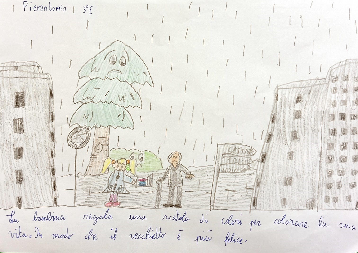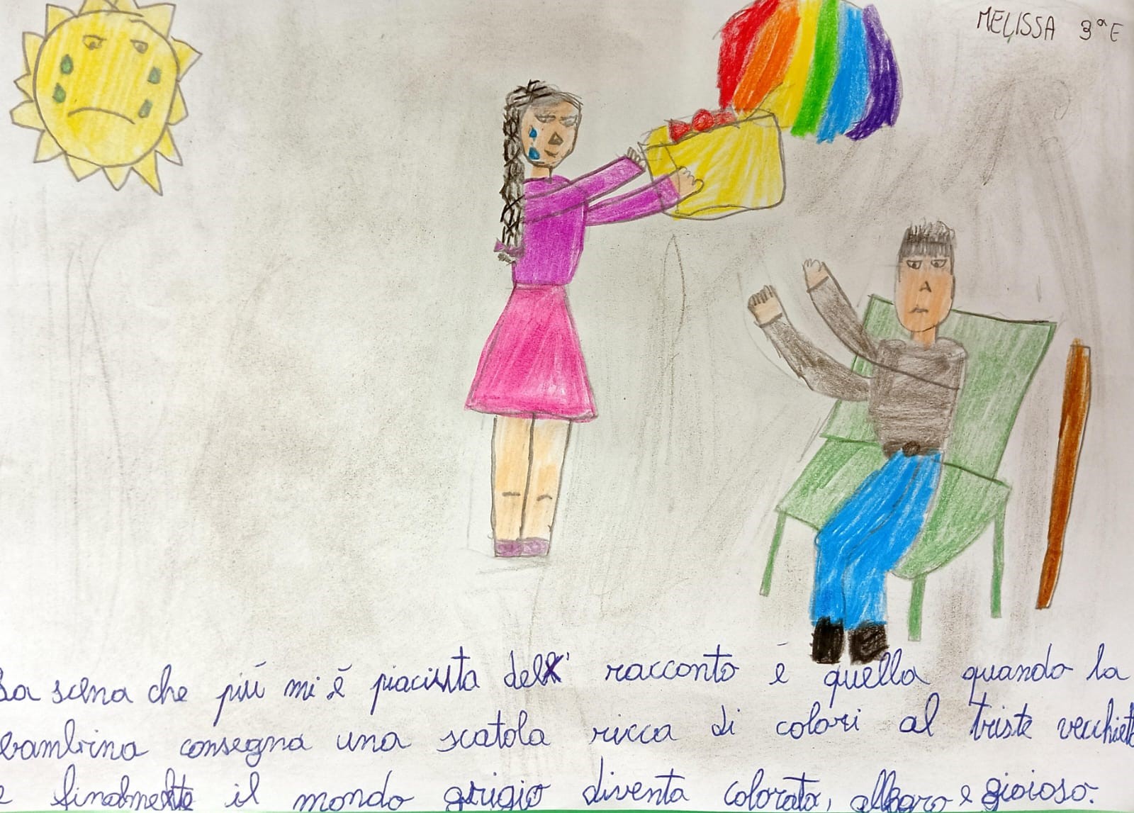 La bambina si commosse tanto e pensò come poteva renderlo felice. All’improvviso si ricordò del suo bel paesino che aveva lasciato e volle regalargli una scatola di colori ed un forte abbraccio.