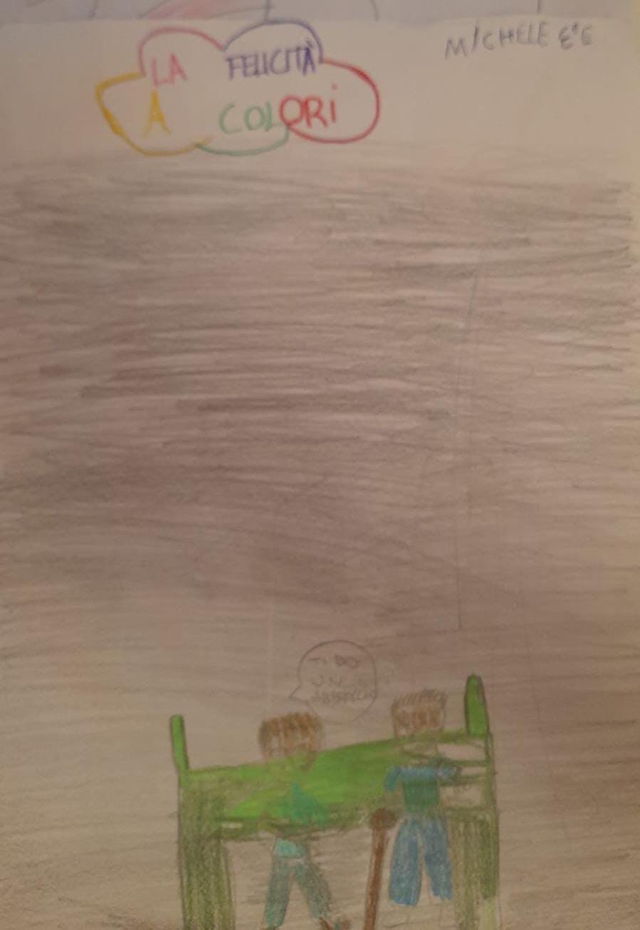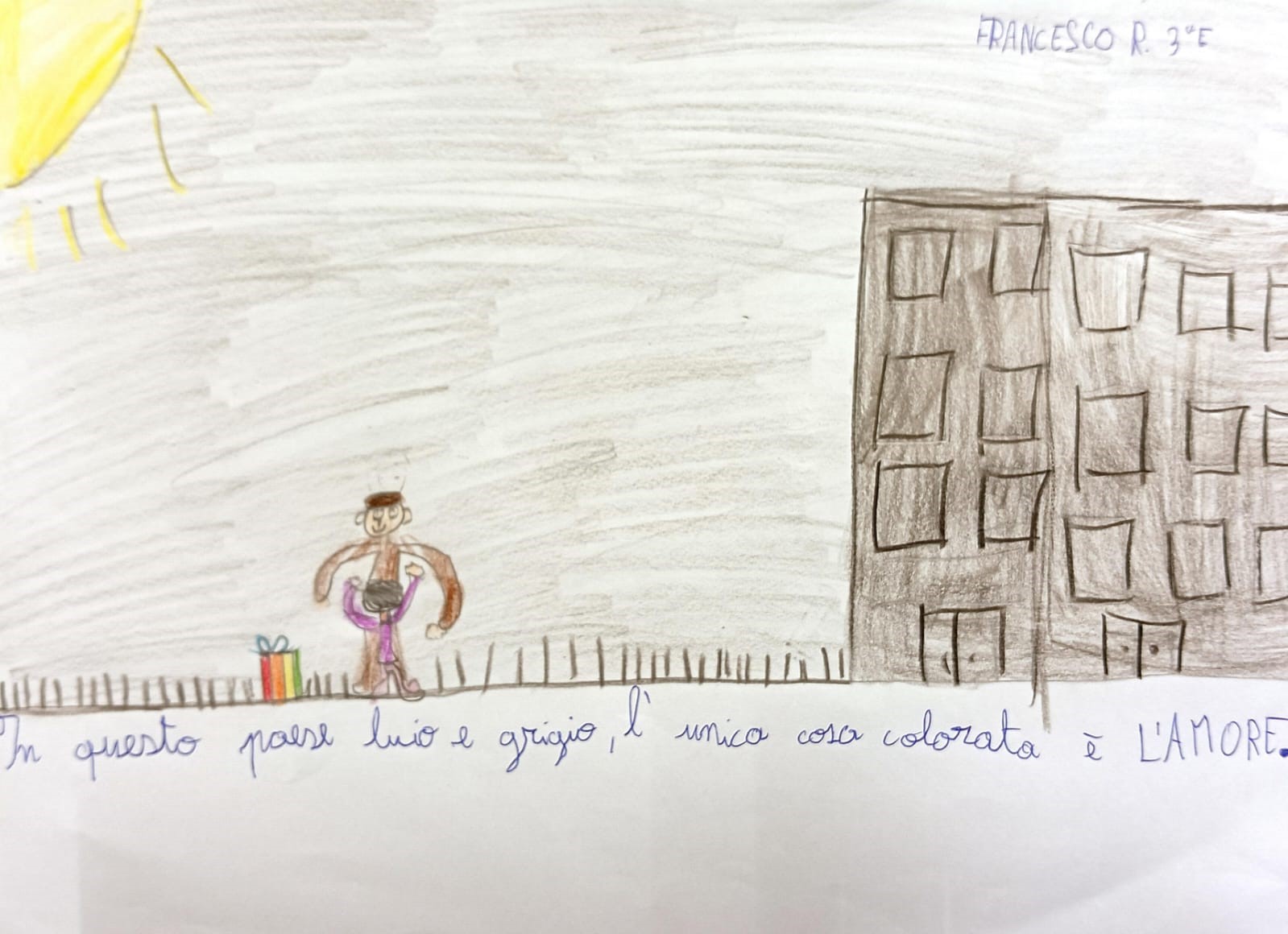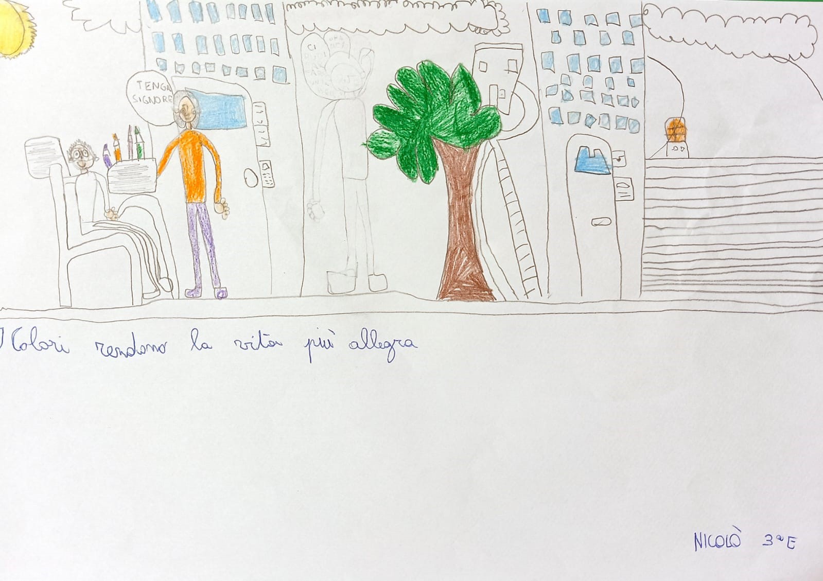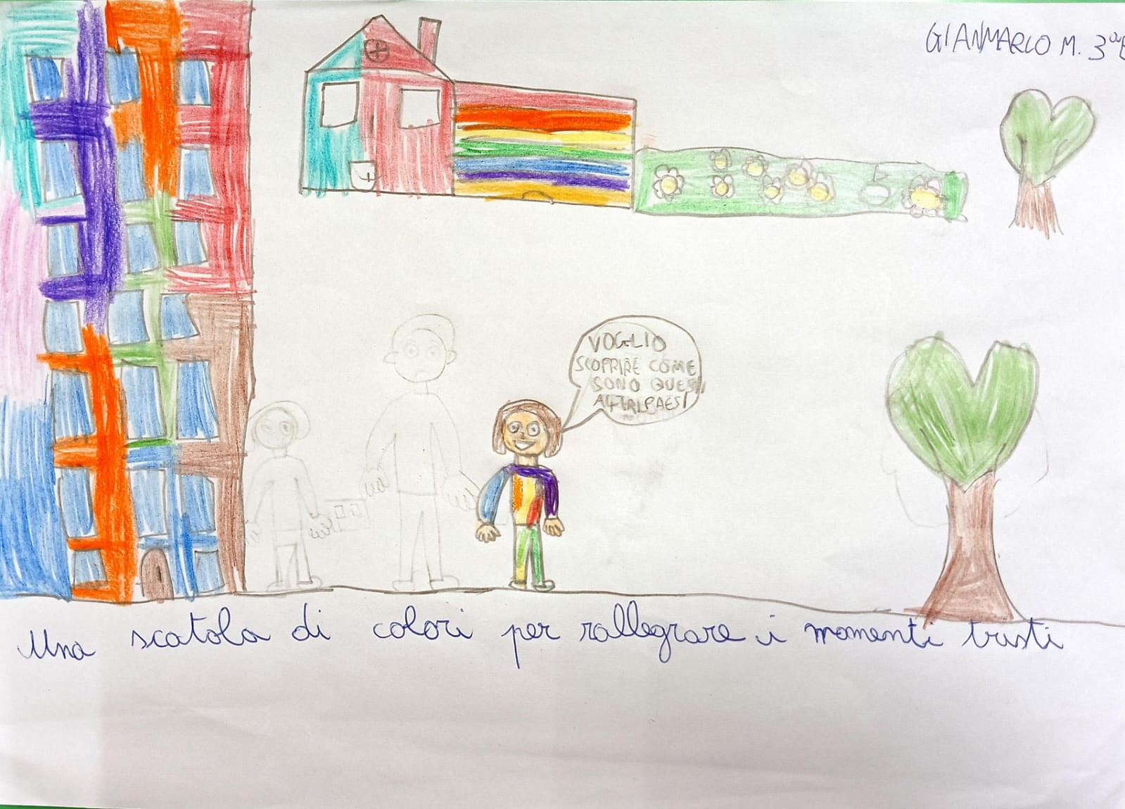 La bambina si commosse tanto e pensò come poteva renderlo felice. All’improvviso si ricordò del suo bel paesino che aveva lasciato e volle regalargli una scatola di colori ed un forte abbraccio.