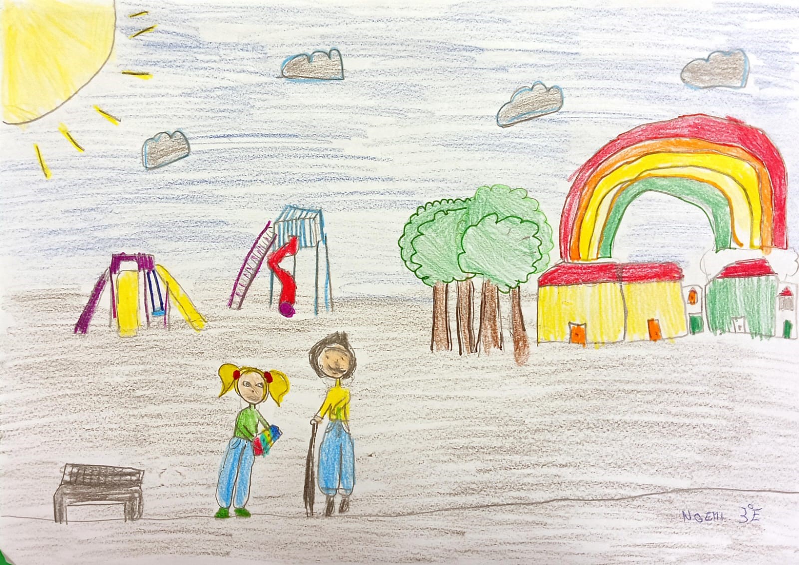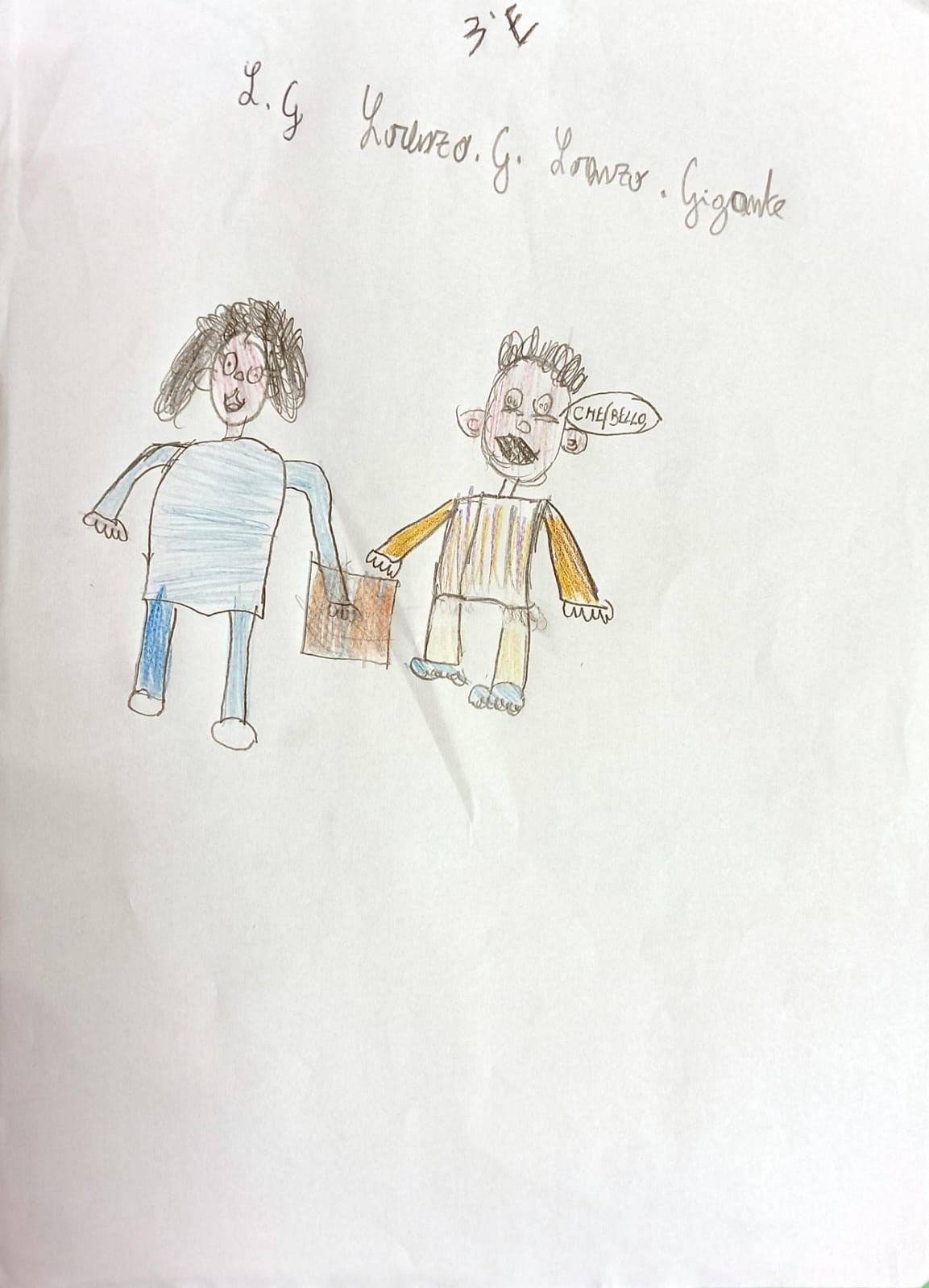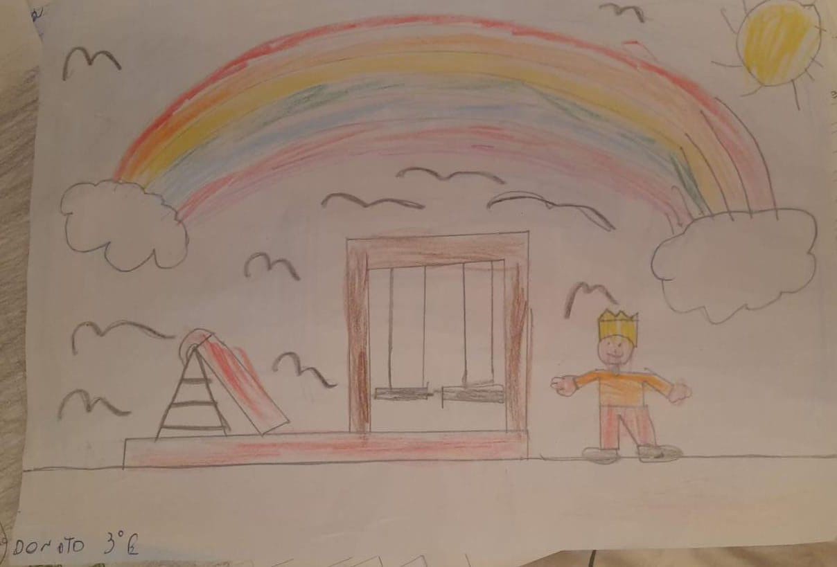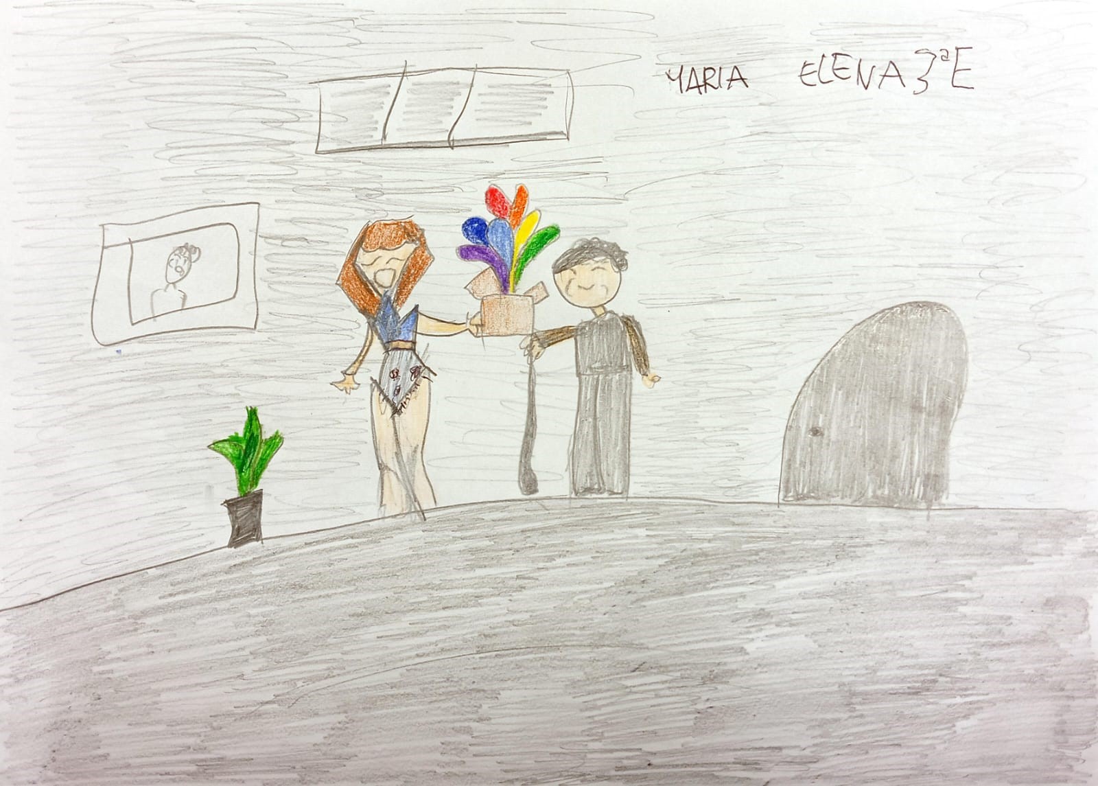 La bambina si commosse tanto e pensò come poteva renderlo felice. All’improvviso si ricordò del suo bel paesino che aveva lasciato e volle regalargli una scatola di colori ed un forte abbraccio.